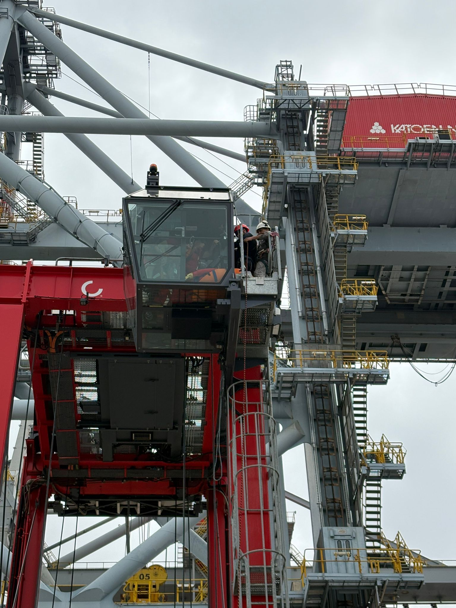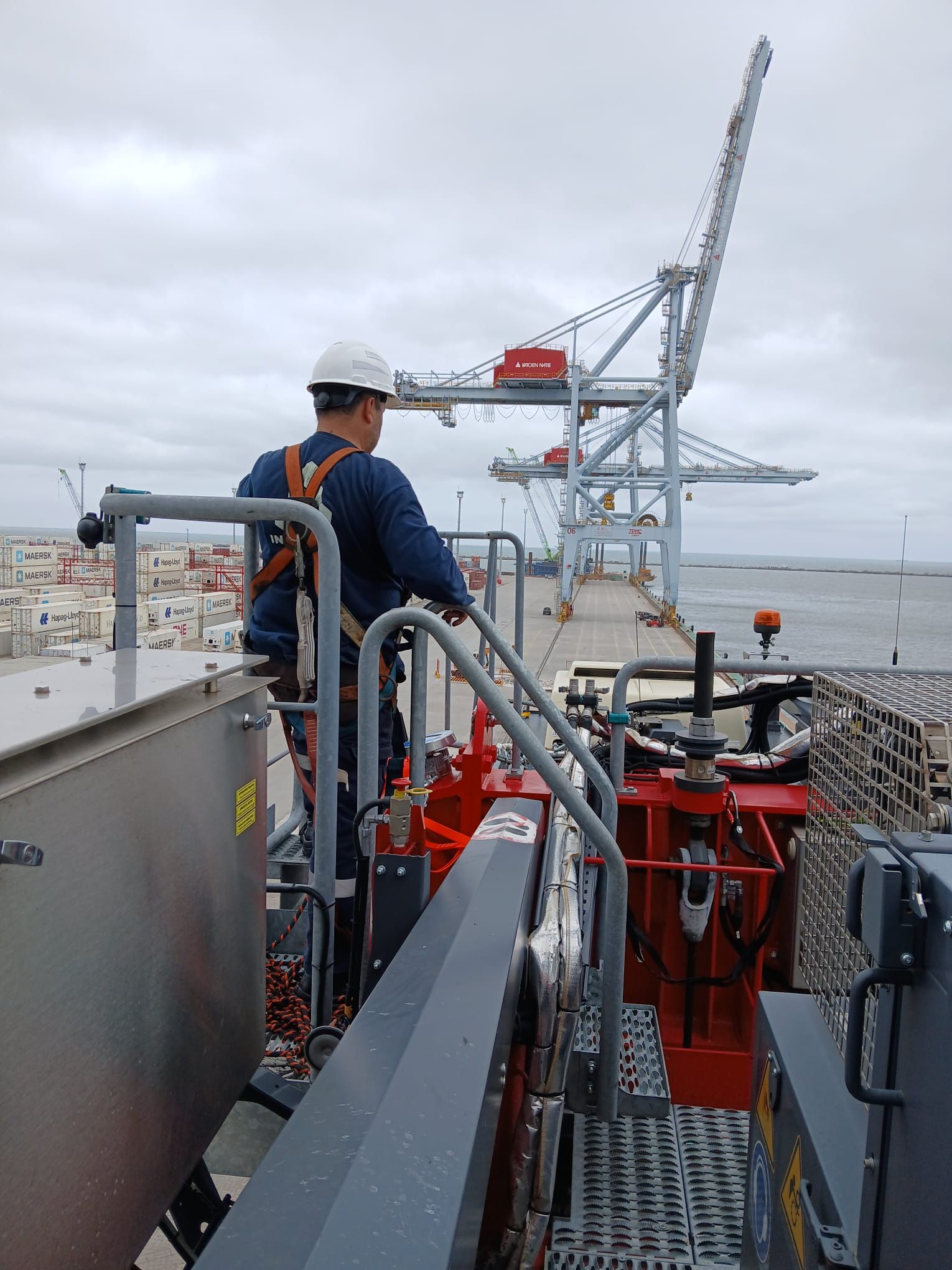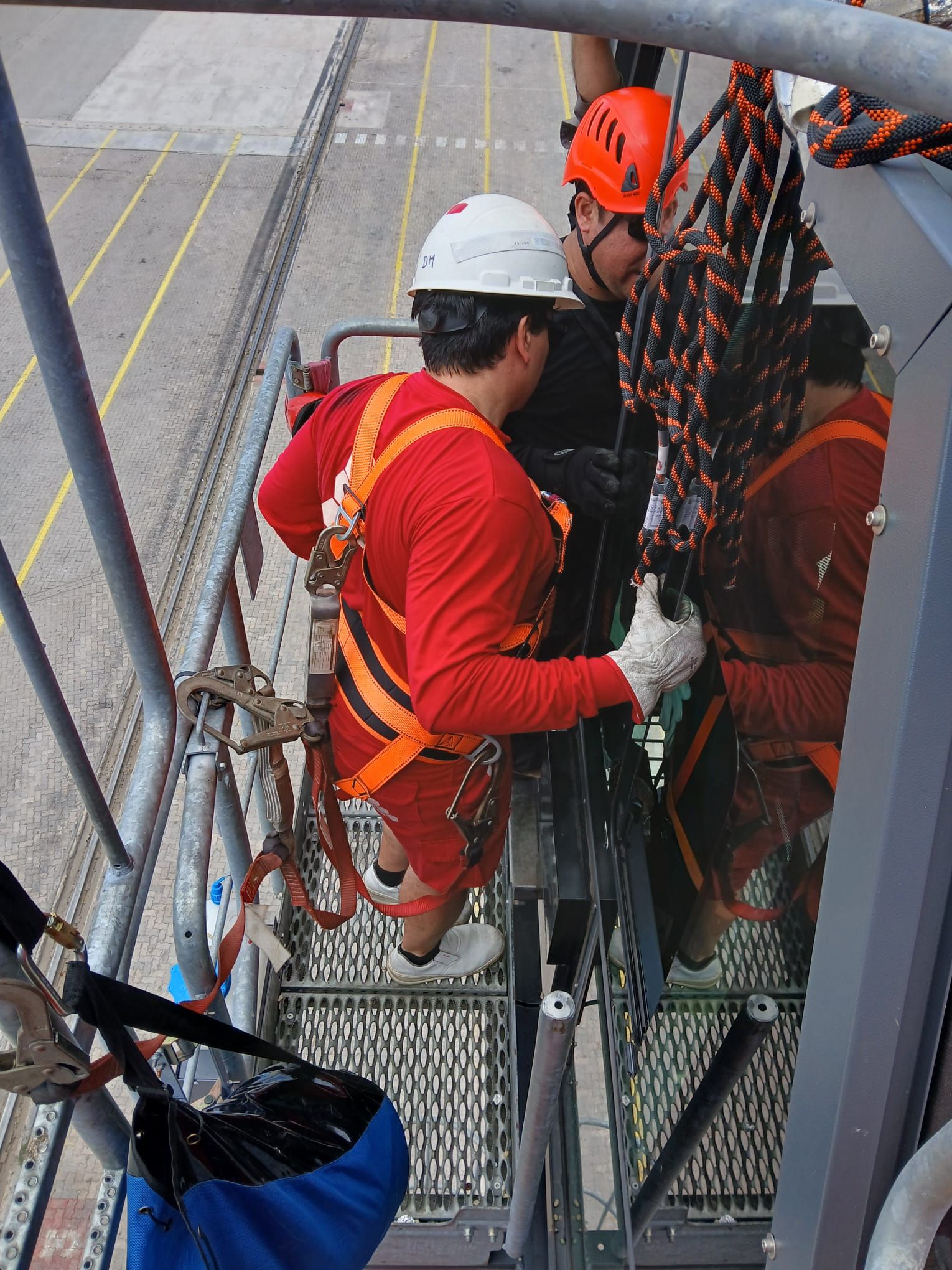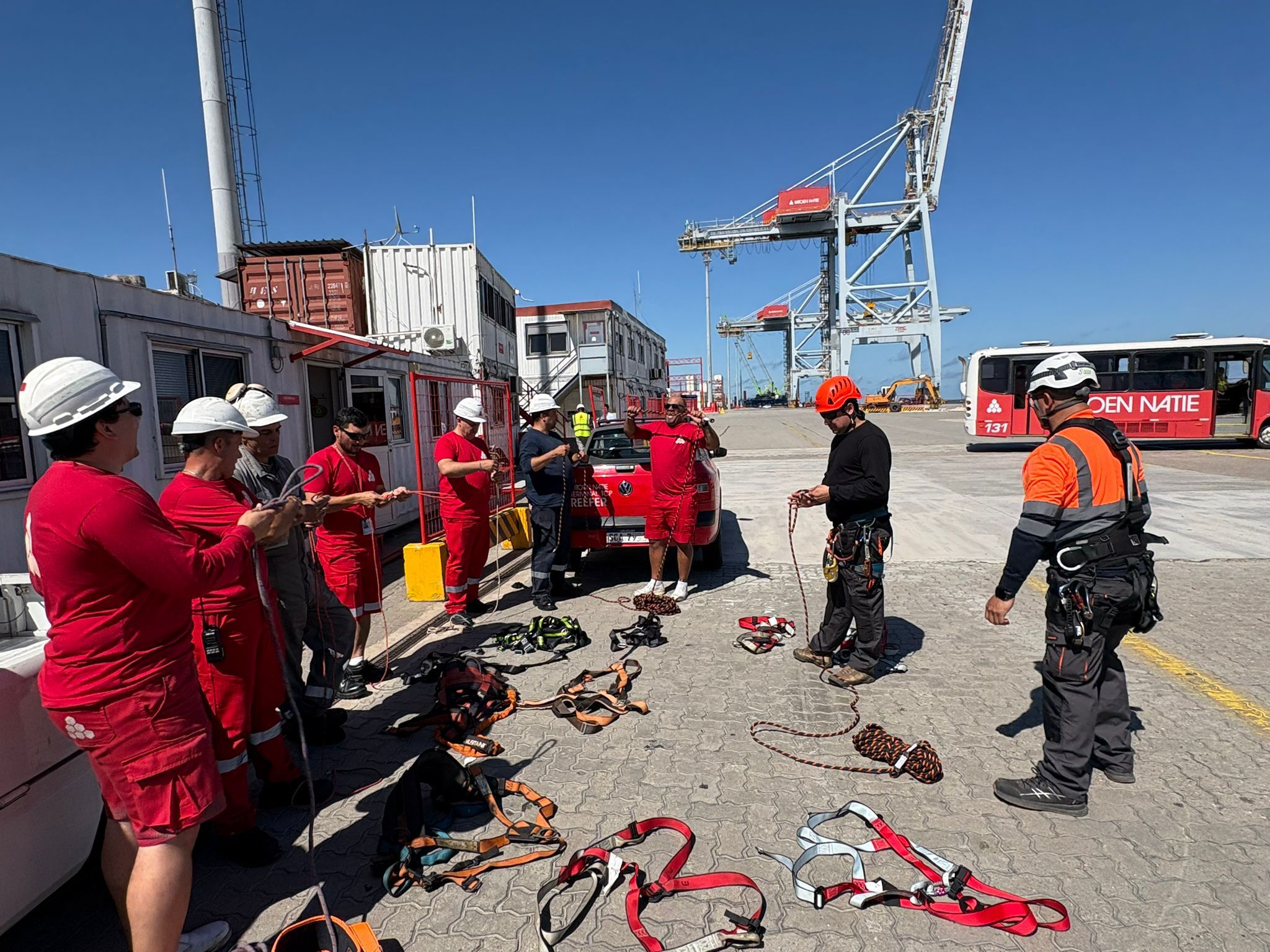 Se efectuó el pasado 28/11/2025, la instancia final de capacitación programada de Rescate en Altura de Nivel Básico sobre Grúas SC Kone, para el personal que desarrolla actividades en Terminal Cuenca del Plata (TCP), con un total de 12 participantes. En total se realizaron tres instancias de capacitación, con la finalidad de aprender, no solo el manejo del nuevo equipamiento de rescate de la Terminal, sino aplicar las técnicas de descenso de una persona inconsciente sobre uno de los equipos empleados en la misma, como lo es la Grúa SC Kone portacontenedores, en situación en la cual, no se puede acceder a la cabina de la misma, por medios externos, y deba realizarse el descenso del operador.